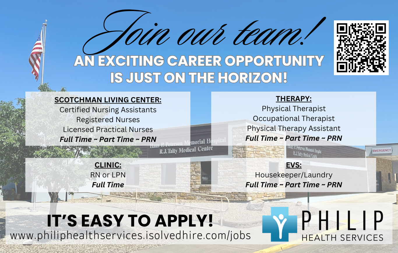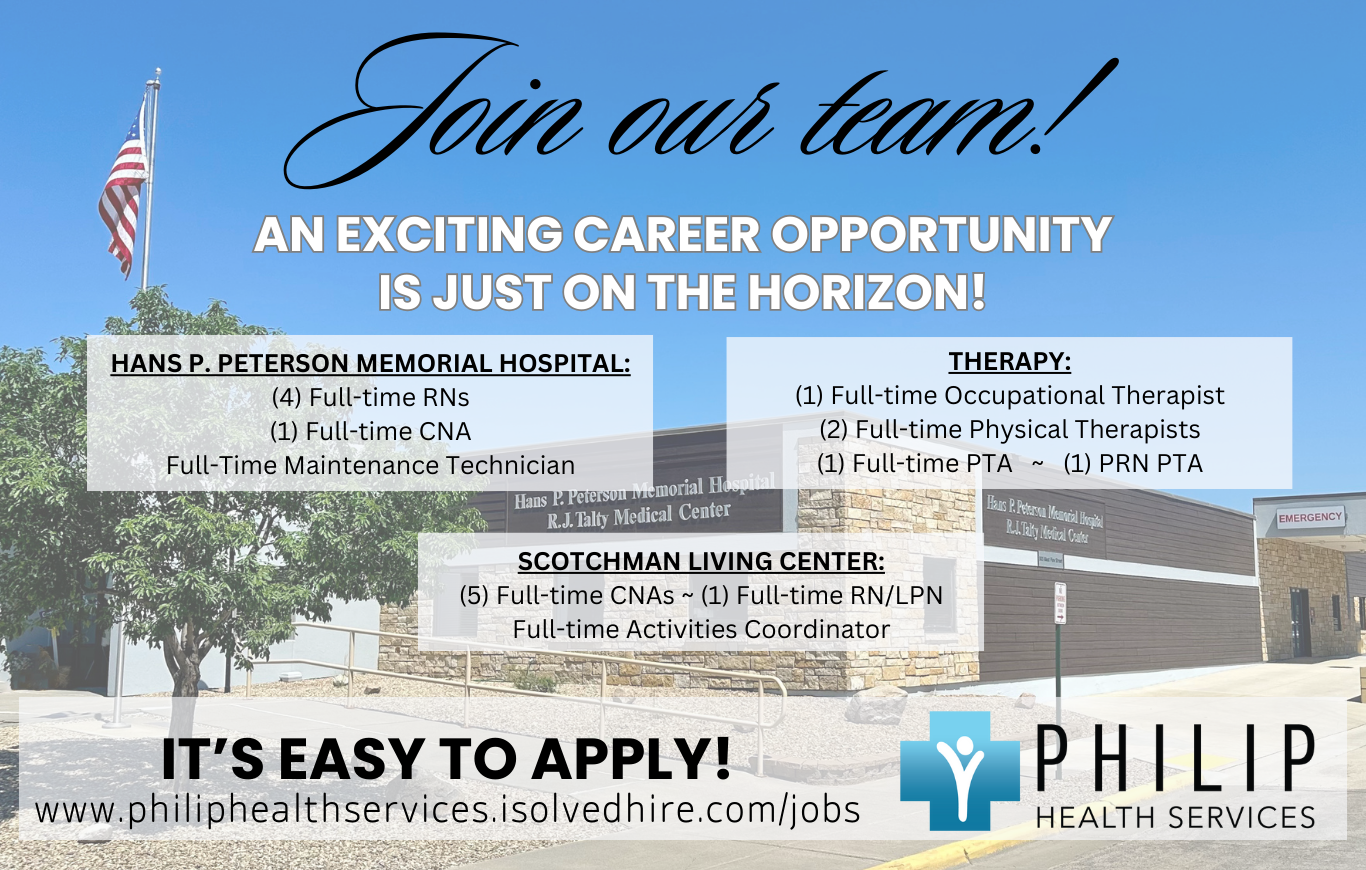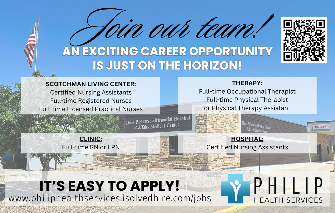 Call (605) 859-3877, for more information about job openings at Philip Health Services.